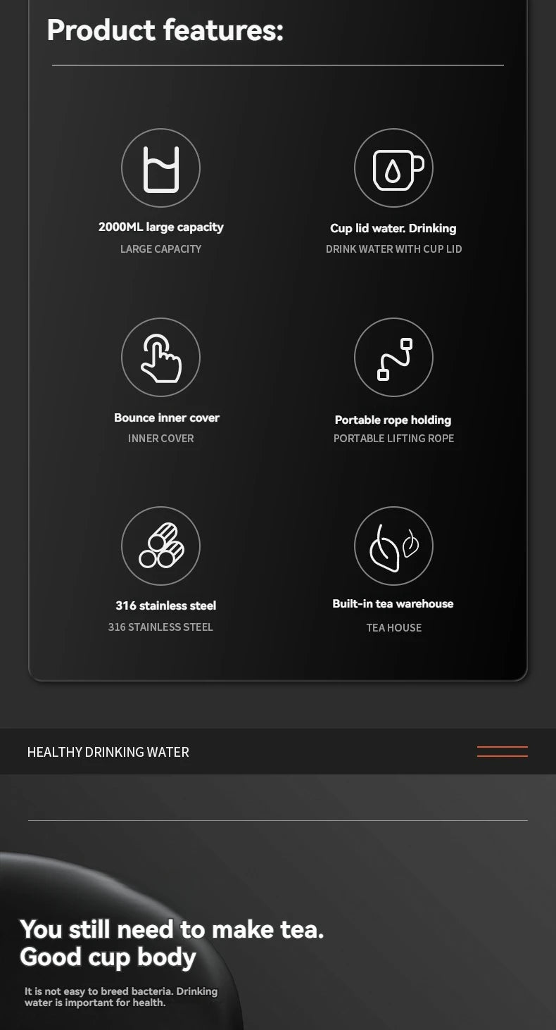 2L Thermos Insulated Water Bottle Hot Water Bottle Vacuum Flask Smart coffee drinkware cup Stainless Steel Double Wall Kettles