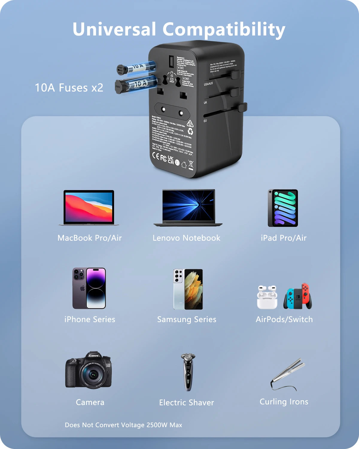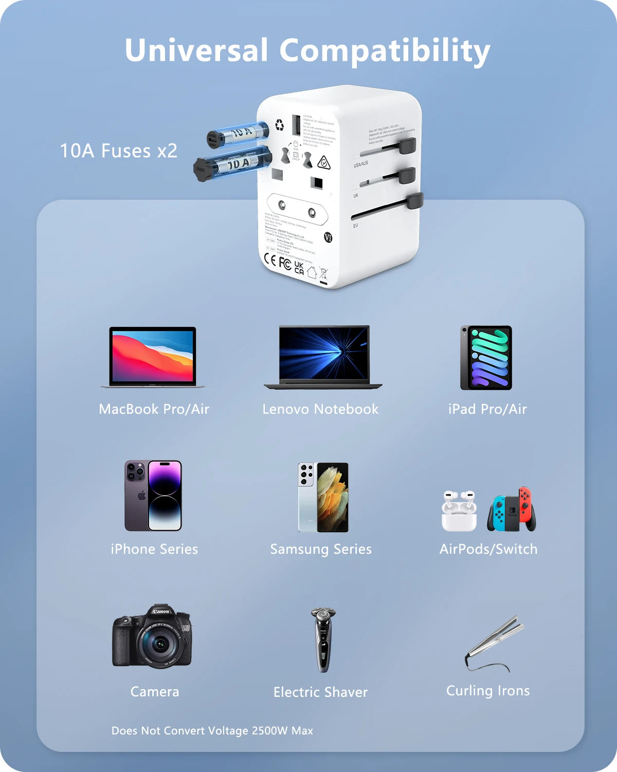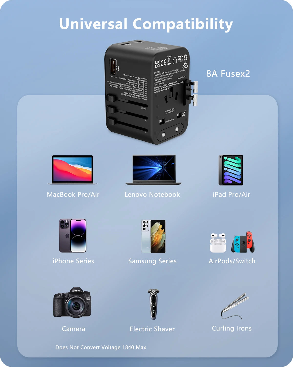 • Multiple Ports :With 5 USB ports and 8 outlets, this adapter can handle all your charging needs while traveling.