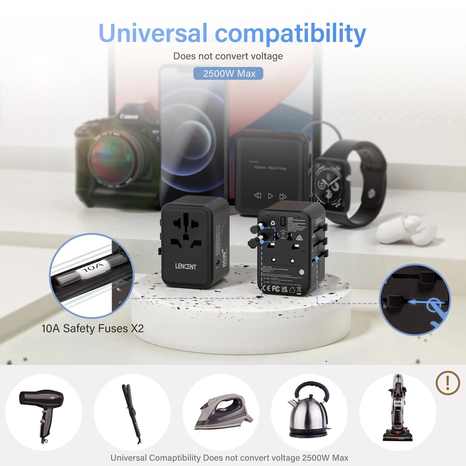 The LENCENT travel adapter with 2 USB Ports&3Type C Ports is capable of intelligently identifying connected devices and detecting and delivering optimum charging current, ensuring fast and safe charging.
