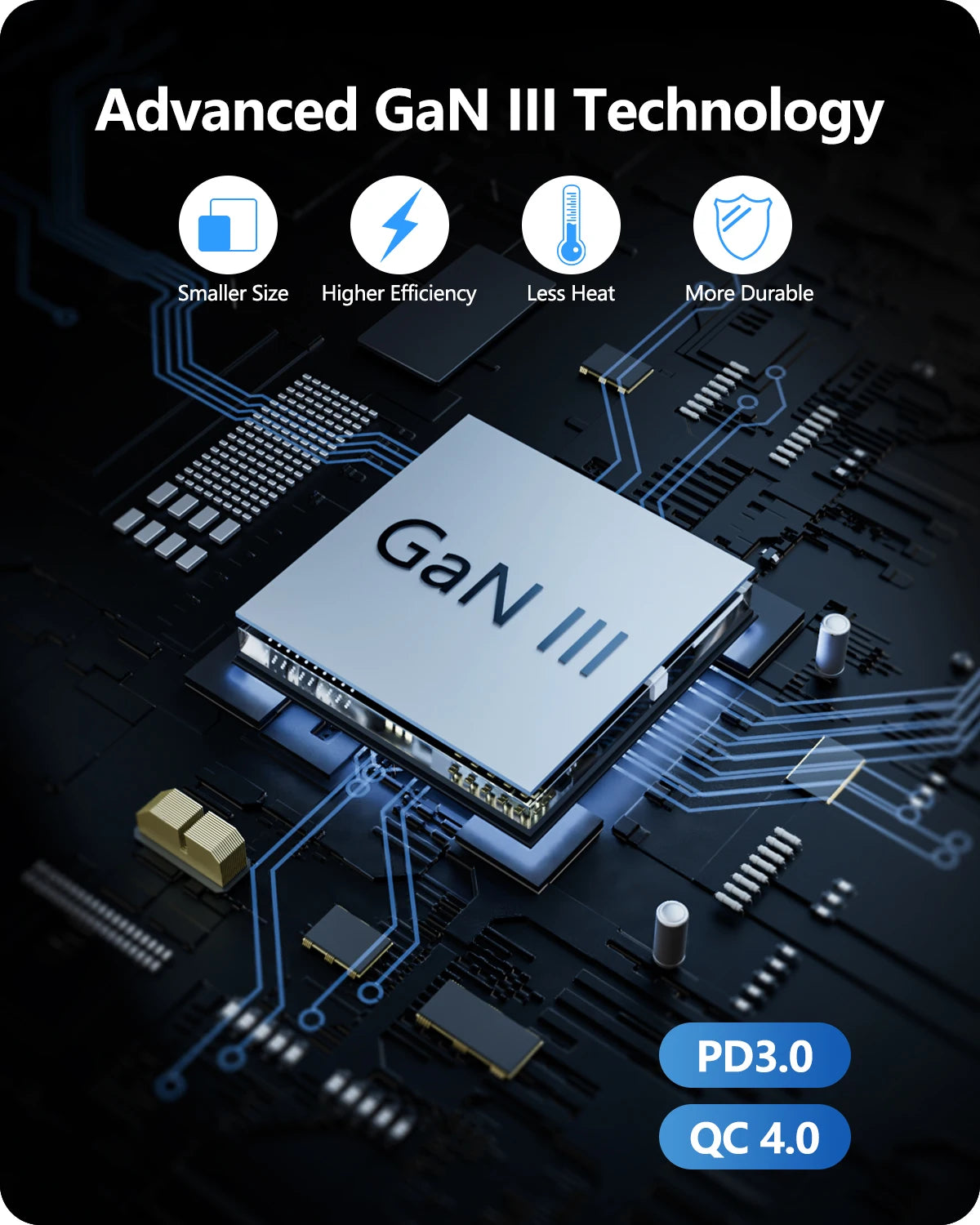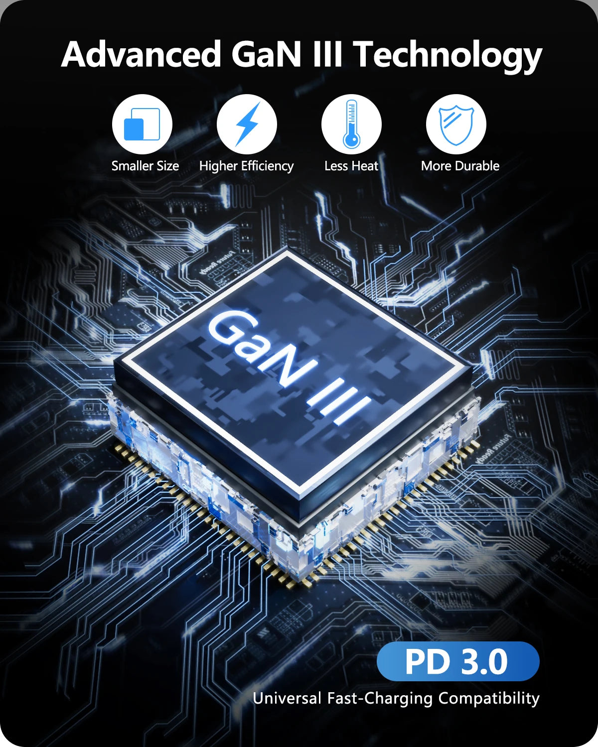 Third-gen GaN semiconductor material offers a higher electric conduction with lower heat radiation, making travel adapter more powerful and much smaller.